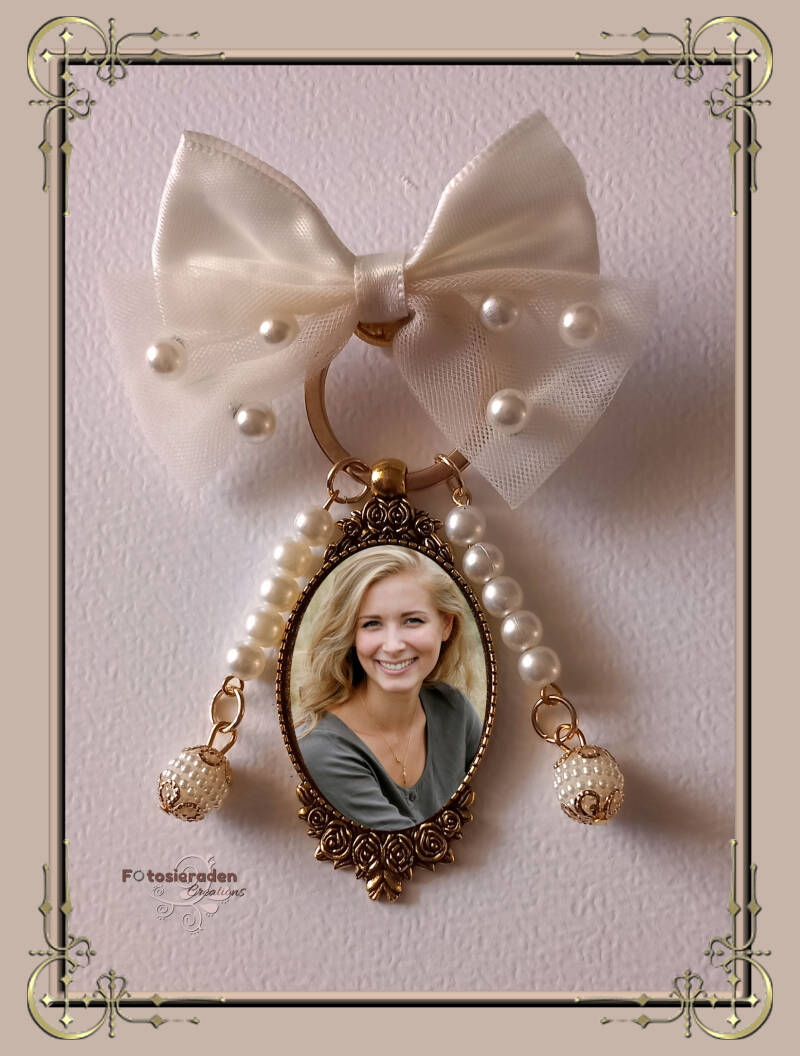 Kleine broche met fotomedaillon mooi om aan je boeket vast te maken. €14.95