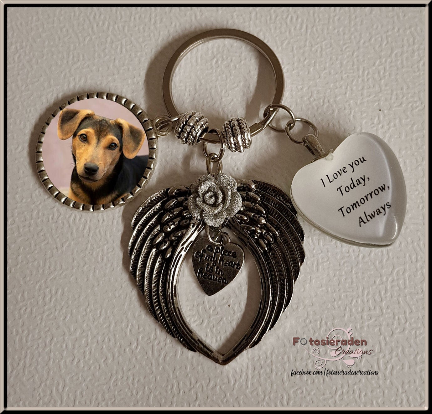 Sleutelhanger met twee foto's, de kralen en roosje kunnen ook in een andere kleur. geschikt om er foto's van dier maar ook van kinderen in te laten maken.