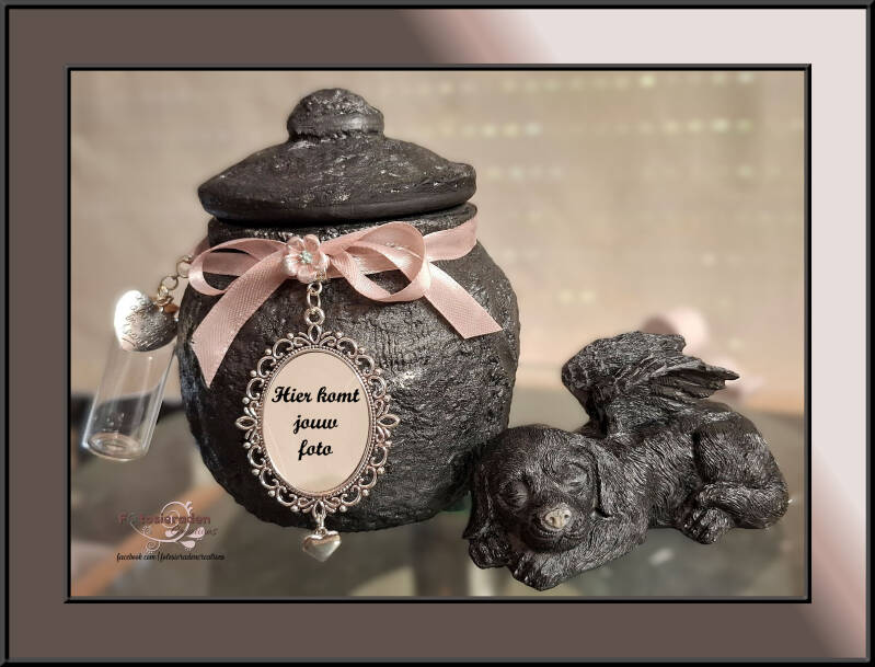 Black urn met zacht roze deze is zowel geschikt voor een persoon maar ook voor een hondje, bij de persoon komt het hondje te vervallen €39.95